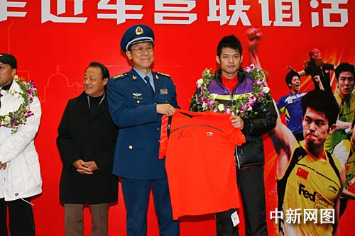 而身為軍人的林丹的開場白則是“回家的感覺真好!”,“超級丹”表示,“雖然身為軍人,但是回軍營的時間卻并不多。今天非常高興來到軍營,這身軍裝也提醒著我的職責(zé),要不斷取得好成績來不辜負(fù)這一身軍裝!被顒又校值ず屯鮾x涵將一套中國羽毛球隊專用的李寧羽毛球裝備親手送給駐軍將士。