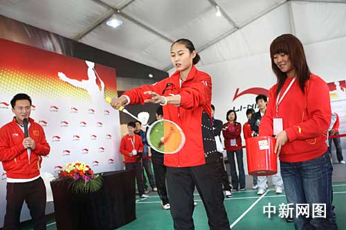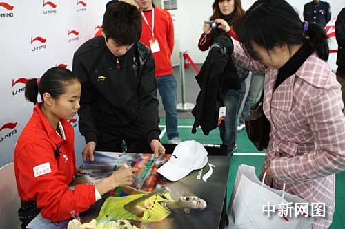 中新網(wǎng)上海十一月二十二日電(宗晨亮)二十二日,2009年中國公開賽進入決賽日。已經(jīng)結束比賽任務的王儀涵在李寧互動體驗區(qū)參加與球迷的互動活動,之后還她為球迷簽名留念。