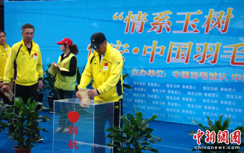比賽開始前,中國羽毛球隊全體運動員、教練員和工作人員為玉樹災(zāi)區(qū)進(jìn)行現(xiàn)場捐款。此外,此次賑災(zāi)義賽得到眾多企業(yè)的支持,恒安國際集團捐款50萬元人民幣,李寧(中國)體育用品有限公司、北京夢奧公司(聯(lián)邦快遞)、紅牛維他命飲料有限公司、喜得龍(中國)有限公司分別捐款10萬元。