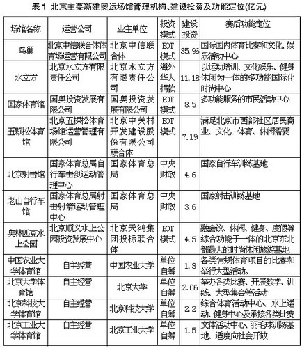 北京奧運(yùn)場(chǎng)館建設(shè)積極借鑒發(fā)達(dá)國(guó)家的先進(jìn)經(jīng)驗(yàn),采用BOT模式(指在大型體育場(chǎng)館的建設(shè)中引入民間資本進(jìn)行建設(shè),場(chǎng)館建成后,政府允許其享有一定時(shí)期的經(jīng)營(yíng)權(quán)及經(jīng)營(yíng)收益,之后政府即無償收回經(jīng)營(yíng)權(quán)),將場(chǎng)館建設(shè)與賽后利用有機(jī)地結(jié)合起來。北京12個(gè)新建奧運(yùn)場(chǎng)館共投資83.69億元,其中業(yè)主自籌占50.46%,地方財(cái)政投資占25.51%,國(guó)家財(cái)政投資占10.67%,海外華人捐贈(zèng)占13.35%(見表1)。一年來奧運(yùn)場(chǎng)館的經(jīng)營(yíng)業(yè)績(jī)證明這種模式是成功的,這無疑為今后我國(guó)大型體育場(chǎng)館的建設(shè)和賽后利用提供了可資借鑒的經(jīng)驗(yàn)。