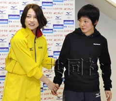 將代表日本參加溫哥華冬奧會的15歲女子速滑選手高木美帆(右)與前輩岡崎朋美選手握手。