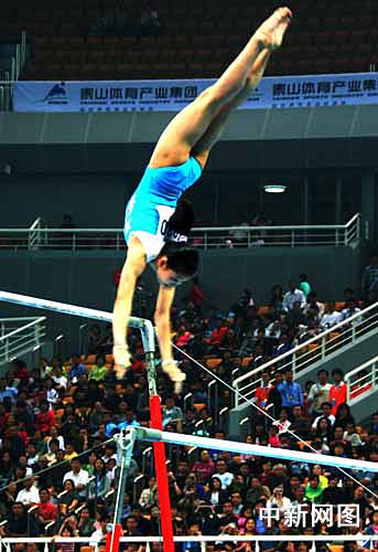 中新網(wǎng)濟(jì)南5月16日電(記者 胡洪林 王超)5月16日晚,山東省濟(jì)南奧體中心明星薈萃、人聲鼎沸,2009年全國(guó)體操錦標(biāo)賽進(jìn)行了前5個(gè)單項(xiàng)的決賽。在此經(jīng)過一番激烈的角逐,5枚金牌各得其所!耙唤恪背谭坪翢o懸念?yuàn)Z得跳馬冠軍,江鈺源一洗昨日比賽失誤之不幸,行云流水般出色完成整套高低杠動(dòng)作,喜笑顏開的捧走這一單項(xiàng)金牌。