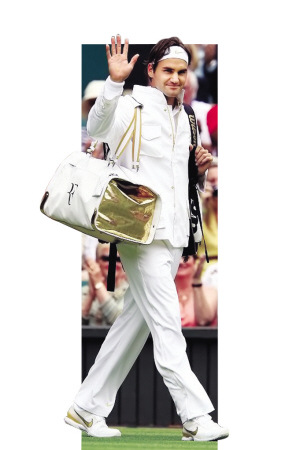 盡管在去年史詩般的決賽中輸給了納達(dá)爾,但當(dāng)他的這位宿敵黯然宣布因傷退出溫網(wǎng)后,剛剛完成全滿貫榮耀壯舉的費(fèi)德勒無疑成了球迷們的惟一想念之人。于是,組委會(huì)“順應(yīng)民意”的安排費(fèi)德勒頂替納達(dá)爾為安裝了頂棚的全新中心球場(chǎng)打響今年的揭幕戰(zhàn),而當(dāng)觀眾們目睹心中的偶像以吸引眼球的“時(shí)尚天王”裝扮向他們尊貴的揮手致意時(shí),整個(gè)球場(chǎng)的熱度就再不曾降低過。