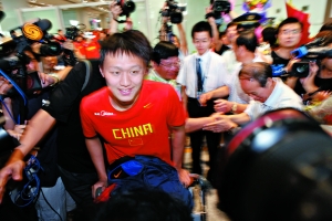 張琳推著行李車,走在運動員隊伍的最前面,他接連接過兩束鮮花。攝影記者將他團(tuán)團(tuán)圍住,閃光燈閃爍個不停。昨天中午,中國游泳隊載譽返京,在首都機場張琳成為最受關(guān)注的明星。接受采訪的間隙,還忙著給粉絲簽名。