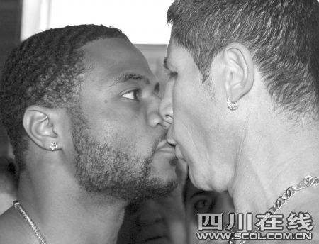 賽前,兩位火爆的拳王互相用口水戰(zhàn)為自己打氣,衛(wèi)冕拳王帕斯卡爾自信地喊道:“我不會(huì)花太長(zhǎng)時(shí)間擊倒他,所以不要來(lái)晚了。”并揚(yáng)言要將對(duì)手布蘭科打成“血醬”。隨后,帕斯卡爾還挑釁地同布蘭科鼻對(duì)鼻的對(duì)峙,不過(guò),由于兩人挨得太緊、過(guò)于“親密”,讓火藥味十足的對(duì)峙變成嘴對(duì)嘴的曖昧,讓人忍俊不禁。記者陳甘露