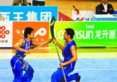 本以為昨天的兩次斷棍事故會給所有參賽隊敲響警鐘,但通過今晚的比賽來看,起碼廣西隊和已經(jīng)出現(xiàn)過一次事故的四川隊并沒有重視比賽器材的選擇和維護(hù)。在男子對練比賽中,廣西隊的黃俊華/黃杰第三個出場,他們表演的項目是樸刀進(jìn)槍,也就是長刀與長槍的對抗。比賽進(jìn)行到了一半,黃俊華一刀砍向使槍的黃杰,長槍抬起格擋時意外發(fā)生,長槍的木桿與刀刃接觸后立刻斷為兩截,廣西隊本項比賽沒有獲得成績。