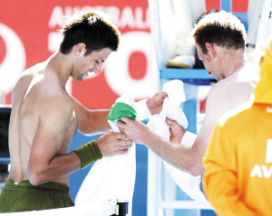 作秀、搞怪,德約科維奇總是別出心裁。他就是大家的“開心果”,走到哪里,總會有“樂子”。這就是年輕的資本,想怎樣就怎樣。就在昨天,在羅德·拉沃爾球場,小德以6∶2、6∶3、7∶5戰(zhàn)勝意大利選手斯托皮尼,邁出了衛(wèi)冕的第一步。獲勝的小德和同樣喜歡足球的對手交換球衣,赤裸著上半身的他向觀眾展示了那長滿胸毛的胸大肌。