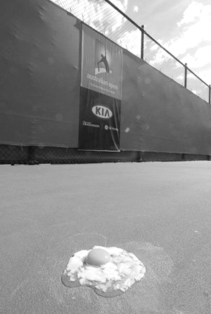果然,昨天一大早,炙熱的陽(yáng)光便烤得人們頭昏眼花,氣溫也很快躥升到40攝氏度以上,使得整個(gè)墨爾本像一個(gè)大火爐。據(jù)報(bào)道,墨爾本郊外的鐵軌在烈日暴曬下,部分已經(jīng)變形,火車因此延誤。有記者在賽場(chǎng)中央試著打了個(gè)雞蛋,沒(méi)想到雞蛋竟被煎熟了。