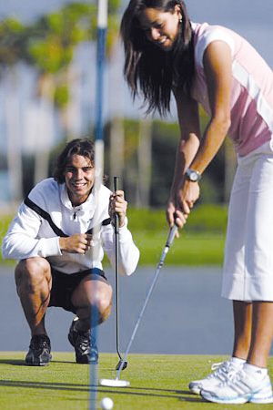 不過此組納達(dá)爾與伊萬的高球互動組圖更有“曖昧”的味道。在果嶺上,納達(dá)爾隨時幫忙糾正伊萬的推桿動作,而每次伊萬將球推進(jìn)后,納達(dá)爾更是給出鼓勵,在果嶺上帥男靚女的傳情更讓人浮想聯(lián)翩,難道這兩人才是“戀人”?
