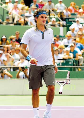 在今晨進(jìn)行的邁阿密索愛公開賽男單半決賽中,費(fèi)德勒摔拍了———在決勝盤第3局再次打丟一個(gè)機(jī)會(huì)球后,他將球拍往地上重重一砸、拍子立馬報(bào)廢。