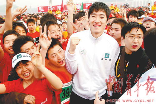劉翔作為主辦方的代言人出現(xiàn)在主席臺上,原本他還要向北京智泉打工子弟學(xué)校的參賽學(xué)生贈送自己簽了名的長跑節(jié)T恤衫,但因為熱情的觀眾幾乎引起擁擠而被改在賽后進行,就連事先約好的采訪也被迫取消。即便如此,“劉翔”、“劉翔”的喊聲還是持續(xù)了很長時間。