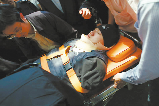 “帽子!借頂帽子!” 幾位先行下車的陪同人員,先從醫(yī)院保安那借了頂帽子。大約3分鐘后,車門才打開,躺在擔架上的湯淼被6名保安抬下車,并徑直送往病房——雖然氣溫高達27攝氏度,湯淼仍穿著大衣,戴著線帽,就連臉部也被那頂保安帽遮得嚴嚴實實。