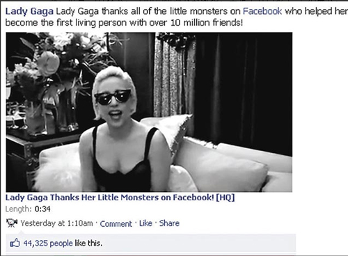 榮登在世人氣女王,她向粉絲發(fā)twit說:“多謝那么多小魔怪在facebook追隨我。我有1,000萬個互相緊扣的朋友!毙∧Ч謑ittle monsters,正是她給粉絲的昵稱。