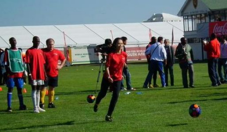 這次親臨南非賽場,對于章子怡來說是個難得的機遇,而且有幸與她喜歡的昔日球星合影作為永遠(yuǎn)的留念。她說:“我今年作為特奧大使受邀來到南非。這一次,特奧會舉辦了‘團結(jié)杯’比賽,希望通過足球這項大家都熱愛的運動,讓更多人了解智障這個群體!彼宰鳛樘貖W大使,她必須要真槍真刀地上賽場,參加“揭幕戰(zhàn)”比賽!拔宜闶莻球迷,很喜歡看球,只是近幾年拍戲不太有時間看了。這次來南非要上場踢球還是我人生第一次,我只能勉強算個入門級‘球員’吧。”,章子怡說,所幸的是與前亞洲足球先生中田英壽、NBA球星迪坎貝·穆托姆博、法國前國家隊隊員克里斯蒂安·卡倫布等結(jié)為隊友,“以前是在電視上有距離地看這些球星在球場上大展雄風(fēng),這次竟然與他們在一個綠茵場上踢球,我覺得真的難以想象”。這些球星們很敬業(yè),當(dāng)看到章子怡動作不夠標(biāo)準(zhǔn)的時候,會友善地給她示范,“我非常激動能在賽場與他們相遇,正好合影留個念”。