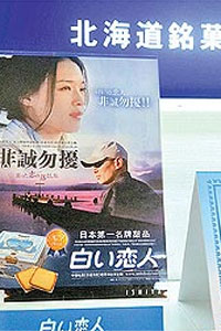 舒淇主演的《非誠勿擾》去年在中國創(chuàng)下驚人票房,帶動取景地日本北海道觀光人潮,旅游業(yè)者趁勢推出電影套裝行程,當(dāng)?shù)孛a(chǎn)“白色戀人”餅干更把海報(bào)當(dāng)免費(fèi)宣傳,在當(dāng)?shù)仉S處可見,連名古屋機(jī)場也看得到,可說是揚(yáng)威日本。