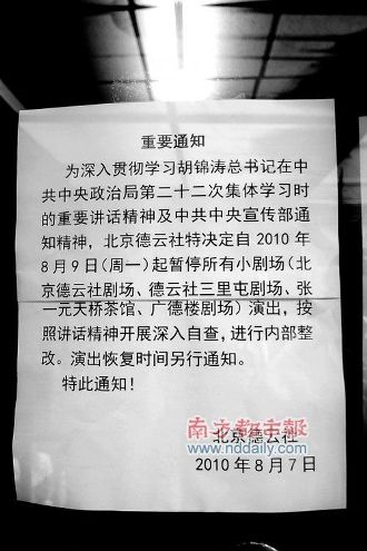 7日凌晨,德云社在其官網(wǎng)德云相聲網(wǎng)上發(fā)表聲明,表示從9日起將停止所有小劇場(chǎng)演出,“北京德云社特決定自2010年8月9日(周一)起暫停所有小劇場(chǎng)的常規(guī)演出,進(jìn)行內(nèi)部整改。具體的演出恢復(fù)時(shí)間,將根據(jù)實(shí)際情況另行通知。特此通告。”聲明傳出,南都記者第一時(shí)間和德云社副總經(jīng)理王海取得了聯(lián)系,電話中,王海拒絕對(duì)此事發(fā)表任何評(píng)論,只是表示“演出近期內(nèi)都不會(huì)恢復(fù)”。