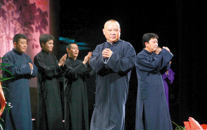 郭德綱、于謙合作10周年專場(chǎng)演出14日如約開(kāi)場(chǎng),現(xiàn)場(chǎng)座無(wú)虛席。此番亮相的郭德綱顯得頗為低調(diào),他在對(duì)話中表示,自己只是一個(gè)說(shuō)相聲的,“能力有限,水平一般”。此次演出郭德綱個(gè)人為舟曲災(zāi)區(qū)捐出了10萬(wàn)元,德云社和演出承辦方也各捐出5萬(wàn)元,對(duì)于因?yàn)榘У咳斩鴷和5?5日的演出,郭德綱表示:“所有15日票的觀眾都可以去退票,也可以留著,等我們開(kāi)演的時(shí)候繼續(xù)使用。現(xiàn)在不是我們不訂演出時(shí)間,實(shí)在是北展后面的演出太多了,一切需要重新協(xié)調(diào)!