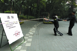 昨日,《非誠勿擾2》劇組在紫竹院公園的拍攝進入第二天。上午9時,記者從東門進入公園,一大片綠地上拉起警戒線,不時有劇組人員進入。綠地內搭起的白色棚子下,擺放著木椅及鋼琴等。據了解,此處將拍攝露天宴會的場景。一些平日在公園晨練的附近居民,昨日改在東門外活動。晨練者們說,他們固定的活動區(qū)域前天被拍戲占用,以為今天能恢復,不料仍被占用。