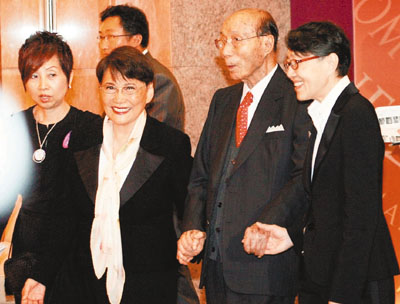 中新網(wǎng)9月29日電 據(jù)香港“文匯報(bào)”消息,“2010年度邵逸夫獎頒獎禮”昨晚在香港舉行,頒獎禮開始前,六叔邵逸夫在女秘書攙扶下與特首曾蔭權(quán)及五位得獎?wù)叩讲季鞍迩懊,讓媒體拍照,當(dāng)六叔準(zhǔn)備入場時,突然現(xiàn)身的六嬸方逸華則在旁邊拖著他進(jìn)場,期間有媒體大聲問到有關(guān)無線轉(zhuǎn)售股份一事,不過六叔未有回應(yīng)