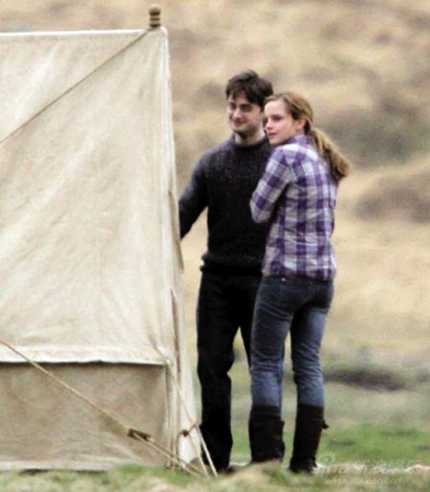 從片場照片以及小說情節(jié)推斷,丹尼爾與艾瑪拍攝的是他們逃亡在外、風餐露宿的場面,“羅恩”魯伯特則因為某些原因暫時離開了他們!豆げㄌ7》全名為《哈利·波特與死亡圣器》,這一集電影將一分為二,上部于2010年11月19日上映,下部于2011年7月15日上映。