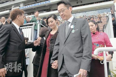 昨日是大年初七俗稱“人日”的喜慶日子,許家名下有3匹愛(ài)駒出戰(zhàn)沙田馬場(chǎng),昨午李嘉欣與丈夫許晉亨十指緊扣步入馬場(chǎng)。一向身形纖瘦的嘉欣身穿紅色背心連身裙,腳踏兩吋高跟鞋,外表明顯比婚前發(fā)福,腹部的小肚腩亦若隱若現(xiàn),加上全身鉆飾行頭,完全是一副幸福少奶奶模樣。