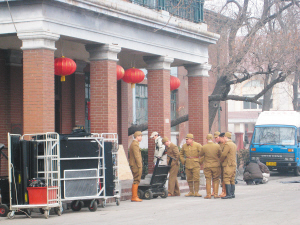 除了道具和布景以外,另一邊演員和造型師也忙得不可開交,記者在現(xiàn)場看到,造型師正一遍又一遍地檢查著各位演員的服飾和妝容,并且還要對每一雙鞋進(jìn)行做舊處理,以達(dá)到最佳拍攝效果。當(dāng)看到幾位群眾演員的軍裝領(lǐng)口,露出不符合時(shí)代背景的內(nèi)衣后,就立刻要求他們脫下。記者看到,就連每一位群演的化妝也都細(xì)致入微,有的因?yàn)橐{(diào)整膚色將粉底涂至脖子根部,有的被化妝師在臉上做出了好似疤痕的效果,更有甚者,因?yàn)榘l(fā)型不符合電影故事發(fā)生年代,竟被發(fā)型師當(dāng)場剃成“板寸”。記者在現(xiàn)場還看到幾位候場的日本演員,敬業(yè)的他們在開拍前很久便開始對著鏡子反復(fù)練習(xí)。