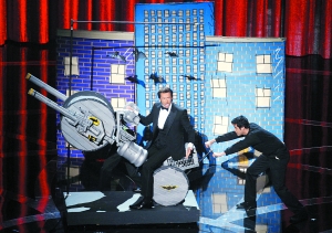 之后杰克曼開嗓大飆一連串的歌秀舞,巧妙把今年入圍的大熱門影片融合布景全唱進(jìn)歌里。首先,他在《貧民富翁》的急智問答布景前笑唱“好萊塢有最多一夜致富的故事”,接著又融合《蝙蝠俠:黑暗騎士》、《本杰明·巴頓奇事》、《朗讀者》電影情節(jié)大秀舞蹈,最后則走下臺(tái)抱起安妮·海瑟薇,兩人上臺(tái)模仿電影《對(duì)話尼克松》的一問一答、搞笑共舞。