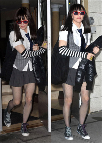 當天的麥當娜上身穿了白色的短袖校服,系著標志性的學生領(lǐng)帶配灰色馬甲,下身穿了灰色超短校服裙,配上了黑色的絲襪和學生的匡威板鞋,連頭發(fā)都變成了標準的清純齊劉海學生頭,手上更是帶了笑臉戒指,力求每個細節(jié)的完美。