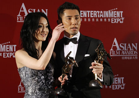 林青霞頒獎的對象也非常有意思——徐克和施南生,這對香港電影圈昔日的最佳拍檔,也是大膽起用林青霞反串男裝,讓東方不敗一角成為影壇佳話的一對電影人。但在去年傳出婚變后,徐克和施南生一直無緣共同出現(xiàn)。昨晚,作為徐克電影工作室的創(chuàng)始人,亞洲電影杰出貢獻(xiàn)大獎的得獎?wù),這對曾經(jīng)的賢伉儷再度攜手走過紅毯,攜手登臺,接受了這個獎項。在發(fā)表得獎感言時,徐克首先感謝為工作室付出過的所有人,包括過世的張國榮、梅艷芳、黃霑等,而在最后,他特別感謝了施南生,“我還記得25年前的一天早上,施南生跟我說,我們成立一個電影工作室吧……沒有她的努力,就沒有工作室的今天。”說到動容時,徐克還擁抱并親吻了施南生。而從來看起來很干練的施南生,在徐克深情的回憶中,難得表現(xiàn)出了小女人的嬌羞。不過,在輪到她發(fā)言時,她又恢復(fù)了制片人的本色,她豪氣地說出:“我們約好了,25年后再回來這里!”記者 劉嘉琦