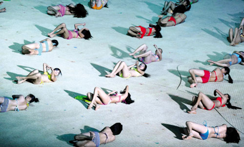 “印象沙灘”是整場演出中最“養(yǎng)眼”的一幕。剛開始,兩個(gè)穿著短裙的姑娘跑到舞臺(tái)中央,一陣狂舞之后,兩人突然豪放地當(dāng)著全場觀眾的面,脫下短裙,露出性感的三點(diǎn)式泳衣。觀眾還來不及驚呼,更多的三點(diǎn)式美女出現(xiàn)了,先是十幾個(gè),后來是上百個(gè)……滿場都是!她們朝著觀眾席大喊:“我們是海南島的姑娘!我們很年輕!我們很漂亮!” ……