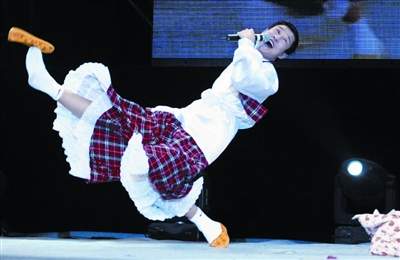 經(jīng)過近2小時的“溫場”后,小沈陽終于壓軸登臺亮相。一看到身穿標志性的紅格子“蘇格蘭”服,背著小挎包的小沈陽從后臺走出來時,觀眾紛紛尖叫著起立。久候在舞臺邊的一群女粉絲手捧鮮花,欲沖過保安防線上前獻給偶像!皩ξ业姆劢z要客氣哦!”小沈陽金口一開,粉絲們立即突破了防線沖上臺去,有女粉絲獻過花后再來一個熊抱,后面的女粉絲更是“搶吻”小沈陽,“陽仔(小沈陽小名)我愛你”的真情表白更在劇場內(nèi)此起彼伏,看來小沈陽的“女人緣”極好。