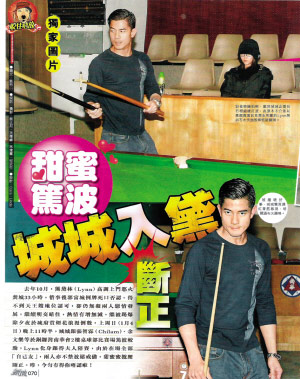 去年10月,熊黛林高調(diào)上門(mén)密會(huì)郭富城33小時(shí),但事后郭富城照樣矢口否認(rèn)戀情。其實(shí),兩人一直繼續(xù)暗中交往,繼早前被爆元旦前夜共賞煙花浪漫倒數(shù)之后,1月4日晚11時(shí)半,郭富城跟張智霖、余文樂(lè)等人在香港銅鑼灣南華會(huì)2樓玩桌球,熊黛林又被發(fā)現(xiàn)做“跟得夫人”陪賽。可能由于在場(chǎng)的全部都是“自己人”,熊黛林與郭富城放松了戒備,甜蜜蜜地?fù)а,不料被香港“狗仔”拍個(gè)正著!