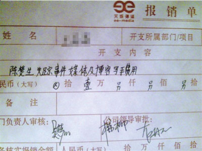 這份報銷單中,開支內(nèi)容一欄寫的是“陳楚生失蹤事件媒體及博客寫手費用”,部門負責(zé)人審核一欄簽有天娛傳媒宣傳總監(jiān)吳夢知的名字,公司領(lǐng)導(dǎo)審批則有天娛總經(jīng)理龍丹妮和天娛副總楊柳的簽名。