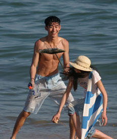 被網(wǎng)民封為“山寨版《流星花園》”的青春偶像劇《流星雨》,自2月18日在廈門開拍以來一直保持神秘。昨天,記者從片方拿到了該片的第一組劇照。在照片中,男一號張翰(飾慕容云海,相當于《流星花園》里的道明寺)與女一號鄭爽(飾楚雨蕁,相當于《流星花園》里的杉菜)正在海邊嬉戲。也許是知道網(wǎng)民炮轟他太“瘦弱”,在拍攝中,張翰努力“拗造型”,讓人想起一句話“胸肌就像是時間,擠擠總有的”。江波