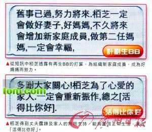 張柏芝在短信中暗示自己從來沒有退出并有意重返娛樂圈工作,更表示“一定會一家幸?鞓贰,甚至留言“舊事已過,努力將來,柏芝一定會做好妻子、好媽媽,不久將來會增加新家庭成員,一定會幸福”。