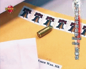 子彈恐嚇信爆出后,在港引起震驚,警方也介入調(diào)查。昨天,陳冠希的老板林建岳接受記者采訪時表示:“因為香港的法律和秩序很好,相信警察會盡快找出寄信人。”