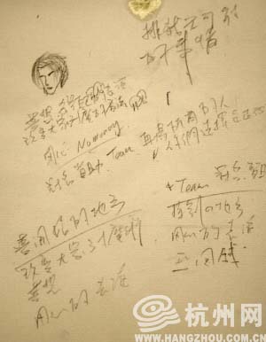 和所有的新聞發(fā)布會一樣,劉謙的新聞發(fā)布會也有冗長的各贊助商發(fā)言時(shí)間。從臺下看,劉謙在贊助商發(fā)言時(shí)間一直很認(rèn)真地在記筆記,而事實(shí)上,他和每一個(gè)在無聊會議上的人一樣,認(rèn)真地在紙上亂涂亂畫:一個(gè)小小的自畫頭像,幾行無意義的漢字,還有一處寫著“No money”,就是這位魔術(shù)師的會議筆記。
