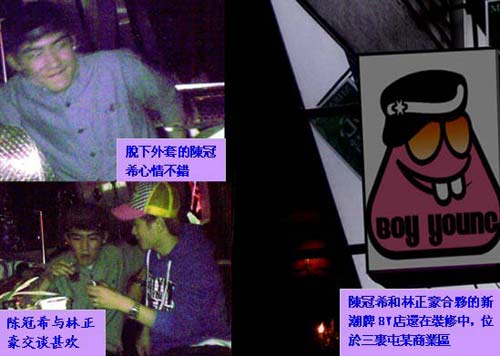 記者隨后跟出門口,卻不見陳冠希一行身影。而他們的奔馳座駕一直停在車位,約凌晨2時許,才見三名保衛(wèi)人員隨同之前陪著陳冠希看商鋪的韓國華裔富家林正豪出來,而后打開車門,拿了什么東西,而后又回到酒吧。記者注意到,該富商一直有保衛(wèi)人員跟隨,而且當晚一直陪同陳冠希,看來關(guān)系非同一般。此外,記者輾轉(zhuǎn)從酒吧大堂經(jīng)理處了解到,與陳冠希同行的林正豪乃韓國上流社會頗有影響力的華人企業(yè)林氏株會社貴公子,早年一直玩轉(zhuǎn)韓國時尚圈,近年也當歌手出唱片,可謂是橫跨時裝和娛樂兩界,不僅擁有韓國頂尖潮流服裝品牌,還是韓國某娛樂公司的幕后老板,而當晚夜店老板早就安排了陳冠希一行到來的保衛(wèi)工作。大堂經(jīng)理透露,這位韓國華裔富家林正豪也是他們老板的好朋友,此行除了陳冠希外,還有京城某地產(chǎn)商之女以及圈內(nèi)某著名女制片人之子,“身家都是上億的!