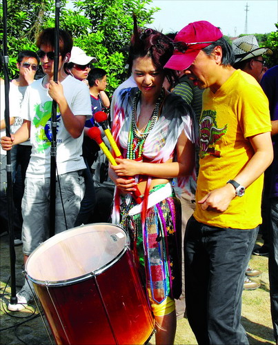 在劇照上,譚維維穿著清涼,再加上混合了各種民族元素的鮮艷裝飾和紋身,火辣的身材暴露無(wú)疑。更加令人驚奇是譚維維的發(fā)型,一縷縷火箭般的沖天直發(fā),頗有漫畫卡通人物的感覺(jué)。而崔健打造出這般造型,是為了表現(xiàn)未來(lái)的風(fēng)格,還是僅僅用于樂(lè)隊(duì)的表演,尚不得而知。激烈的鼓樂(lè)、動(dòng)感的舞蹈、火辣的裝束、夸張的發(fā)型,崔健譚維維共同打造的這部發(fā)生在2029年的未來(lái)成都故事,最終將呈現(xiàn)出一番怎樣的效果,讓人非常期待。