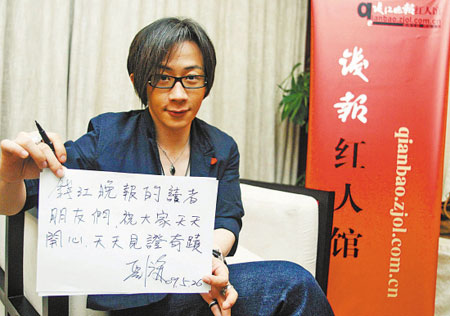 2009年兩大春晚紅人之一——劉謙,來到錢報紅人館做客了。坐在本報記者面前的沙發(fā)上,遭遇到“近景魔術(shù)是否將如同選秀一樣走向死亡”這樣并不令人愉快的話題,劉謙連眉毛也不跳一下,依舊保持著他典型的職業(yè)化的笑容,胸有成竹地拆招:“就算選秀死了,不代表將來人們就不唱歌了,魔術(shù)同樣是不可缺少的。其實,我根本不擔(dān)心這個問題!
