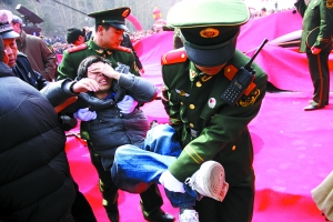 開機(jī)大典在一片鑼鼓和禮炮聲中拉開序幕。當(dāng)?shù)氐臄?shù)千名圍觀群眾剛開始還秩序井然,多數(shù)在遠(yuǎn)處旁觀。但是,隨著眾主創(chuàng)的陸續(xù)登臺亮相,人群中開始騷動起來。盡管現(xiàn)場有人數(shù)頗多的保安維持秩序,但是都保護(hù)著明星和領(lǐng)導(dǎo),并沒有安排專人負(fù)責(zé)媒體席,令300多位群眾瞬間涌上原本只能容納百人的一米多高的簡易媒體臺。