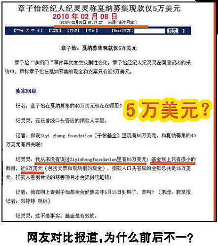籌款之時(shí)見(jiàn)諸報(bào)端的善款數(shù)字,與網(wǎng)友各處追查而得的結(jié)果相差甚遠(yuǎn),有人認(rèn)定章子怡中飽私囊,打著慈善的名號(hào)謀利。章子怡究竟募集了多少善款?700萬(wàn)美元?200萬(wàn)美元?100萬(wàn)美元?50萬(wàn)美元?章子怡說(shuō),在戛納募捐現(xiàn)場(chǎng)籌集到的現(xiàn)金實(shí)際只有1392.36美元。