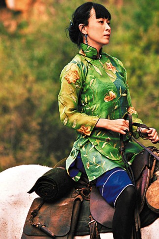 至于葛優(yōu)的造型亦隨嘉玲所飾演的夫人雙雙曝光。長(zhǎng)發(fā)及肩、戴著帽子、外形十足老夫子的葛優(yōu),扮相詼諧,加上一臉落荒而逃的滑稽模樣,落難味十足,與戲中劉嘉玲一身翠紗花褂短打,配緊身馬褲,策馬而騎的英姿相映成趣。