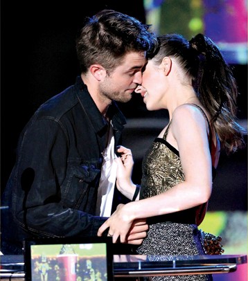 《新月》受追捧主要因?yàn)槟信惶?hào)羅伯特·帕丁森與克里斯蒂·斯圖爾特的化學(xué)作用。而在戲外,兩人也是好萊塢的一對(duì)“明星情侶”。昨日,摘得“最佳接吻”獎(jiǎng)的兩人當(dāng)場(chǎng)為在座觀眾獻(xiàn)上一吻,引來尖叫無數(shù)。