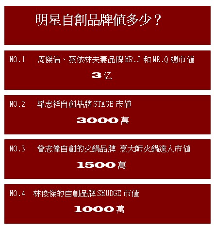 而針對(duì)這種明星以自己名義創(chuàng)立品牌的現(xiàn)象,究竟明星們的品牌價(jià)值值多少?為此記者特意采訪了知名品牌管理學(xué)者的楊教授,據(jù)楊教授解釋:由于藝人本身具有較高的社會(huì)知名度和形象的度,因此藝人創(chuàng)意品牌的價(jià)值起點(diǎn)都會(huì)比普通人高出好幾倍,因此藝人的知名度和形象度與其創(chuàng)立的品牌價(jià)值是密切相關(guān),從某種意義上成正比關(guān)系,而對(duì)娛樂圈的一些藝人及其自創(chuàng)品牌,楊教授也給出一個(gè)系統(tǒng)的市值評(píng)估,如羅志祥的自創(chuàng)品牌STAGE市值 3000萬,林俊杰的自創(chuàng)品牌SMUDGE市值1000萬,曾志偉自創(chuàng)的火鍋品牌烹大師火鍋達(dá)人市值1500萬,而周杰倫與蔡依林這次合伙經(jīng)營(yíng)的MR.J和MR.Q市值,楊教授也給出了一個(gè)值得參考的數(shù)據(jù)3億。