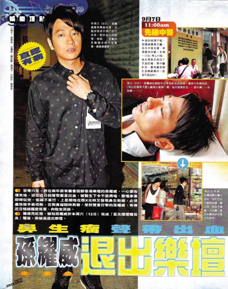 原本10月出唱片的孫耀威,上月忽然向所屬的環(huán)球唱片公司以聲帶不適為由,要求無限期押后錄音,并推掉一連串登臺工作。據(jù)知半年前,孫耀威發(fā)現(xiàn)每次表演后喉嚨便出現(xiàn)劇痛和紅腫,起初他以為是一般歌手常有的聲帶發(fā)炎,于是便戒酒救聲,但一直沒有好轉(zhuǎn),最近才被醫(yī)生證實(shí)是聲帶出血,每次唱歌都會引發(fā)聲帶微血管爆裂,喉嚨充血。聲帶出血將孫耀威的事業(yè)計劃全盤打亂,他原本計劃明年在臺灣出碟,如今都因病泡湯。