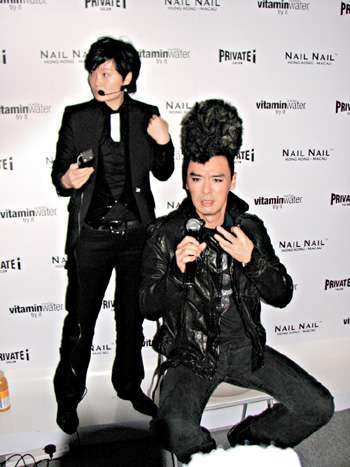 中新網(wǎng)12月11日電 前晚鐘鎮(zhèn)濤和郭富城緋聞女友王秀琳等人在香港出席發(fā)型活動(dòng),為了支持活動(dòng),大家的發(fā)型都十分夸張。鐘鎮(zhèn)濤不僅頭頂巨型雞冠頭,還自曝因女友懷孕,所以自己吃生發(fā)藥來壓抑欲望。