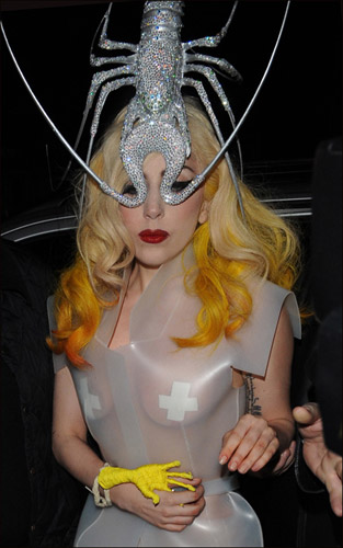 中新網(wǎng)3月2日電 “百變天后”Lady Gaga剛完成一連兩場(chǎng)倫敦演唱會(huì),有傳上周五首場(chǎng)表演因超時(shí)45分鐘而遭場(chǎng)館罰款19,000美元,卻沒有阻她第二天到倫敦著名高級(jí)中菜館舉行慶功宴的興致,為了配合餐廳氣氛,她竟想到把一只銀色龍蝦放上頭當(dāng)帽戴,不知同去就餐的美國搖滾歌手Bruce Springsteen是否已經(jīng)見怪不怪。