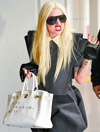 報(bào)道描述,Lady Gaga手跨柏金包,用日語寫著“我愛小怪物,我愛東京”,不知是不是要討好日本歌迷。