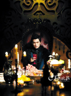 在新專輯預(yù)售海報(bào)上,周杰倫以一個(gè)中古世紀(jì)的吸血鬼扮相出現(xiàn)。只見他臉色蒼白,嘴唇鮮紅,穿一身西裝外套,還罩了一件羽毛披肩,坐在餐桌前若有所思,像是一個(gè)住在城堡中的神秘“吸血鬼王子”。造型師還在周杰倫的指甲貼上帶有鉚釘?shù)闹讣灼屛罩票氖至髀冻鋈A麗感;眼睛里則戴上了特殊的隱形眼鏡,營造出一雙“電眼”,眼里還有動(dòng)物般的直立橢圓瞳孔,詭異得令人戰(zhàn)栗。